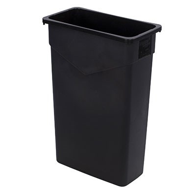Designed for durability and convenience, the Culinary Essentials Rectangular Waste Container in black offers a heavy-duty solution for high-traffic environments. With a capacity of 23 gallons, this container measures 20" x 11" x 29-7/8" and is constructed from tough polyethylene to withstand daily wear and tear. Integrated corner tabs provide added stability for liners, while bottom helper handles make lifting and emptying effortless. SKU_10069308 Model: 342023TRI03