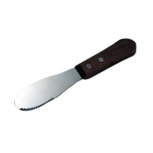 This Culinary Essentials Sandwich Spreader features a 3-7/8" serrated blade, perfect for effortlessly spreading condiments and cutting through sandwiches or breads. The 7-5/8" overall length provides excellent control, while the riveted wood handle offers a comfortable, sturdy grip. Ideal for professional and home kitchens, this spreader combines durability with rustic charm, making it a versatile tool for preparing sandwiches, bagels, and more. SKU_10075495 Model: 859226