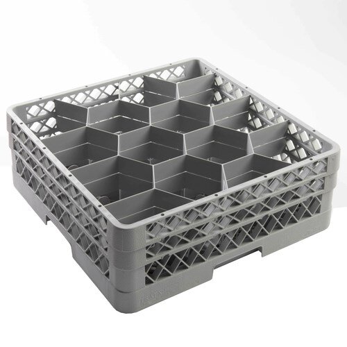 This 12-compartment glass rack comes equipped with one extender and one open extender, providing a maximum compartment height of 6-3/8". The 4-3/4" hexagon compartments keep glassware securely in place, minimizing the risk of breakage during transport and storage. The open bottom and sidewalls ensure efficient cleaning and drying. Made in the USA and NSF-certified, this full-size gray rack is a reliable solution for glassware management in busy restaurants and foodservice operations. SKU_10091911 Model: TR18JA-60-TRI