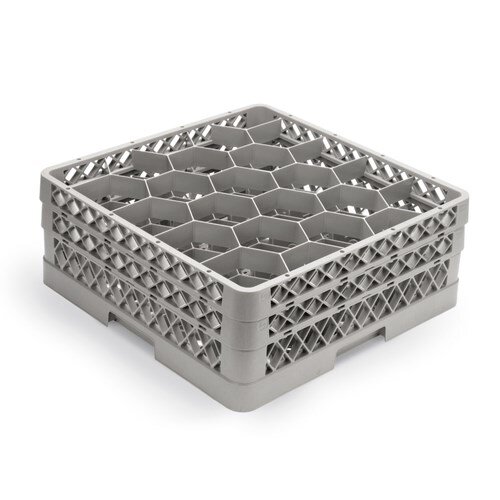 Perfect for larger glassware, this 20-compartment glass rack features 4 extenders and 1 open extender, offering a maximum compartment height of 11". Each 3-15/16" hexagon compartment provides ample protection and separation for delicate glassware. The open bottom and sidewalls facilitate thorough cleaning and drying, making this full-size, NSF-certified gray rack a practical solution for restaurants, hotels, and catering services requiring safe and efficient glassware storage. SKU_10091898 Model: TR11GGGGA-60-TRI