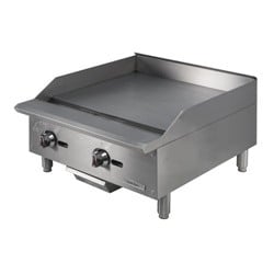 The Kintera Gas Griddle with 2 Burners & Manual Controls offers high performance in a compact 24" design. Featuring two powerful 30,000 BTU stainless steel U-style burners that deliver consistent flame coverage every 6" across the griddle surface, this unit ensures even heat distribution for precise cooking. The 3/4" polished griddle plate, coupled with a fully welded 4" backsplash and sidesplash, makes this griddle both efficient and durable in demanding kitchen environments. Designed with practicality in mind, the Kintera Gas Griddle includes an extended cool-to-touch front edge, adjustable non-skid stainless steel legs, and easy-to-access front pilots. The wide 3 1/4" grease trough and removable stainless grease catch pan streamline cleanup, while double-wall construction with insulated side panels ensures energy efficiency. Large chrome temperature knobs with set screws offer easy and reliable control. Perfect for high-volume kitchens, this griddle combines performance, durability, and user-friendly features. SKU_10021727 Model: KGR24M