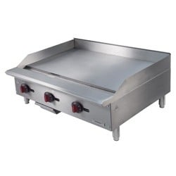 The Kintera Gas Griddle with 3 Burners & Thermostatic Controls is engineered for high-performance cooking with precision control. Featuring three 30,000 BTU stainless steel U-style burners, this griddle delivers consistent flame distribution across every 6" of its 3/4" polished griddle plate, ensuring even heat across the surface. With an adjustable temperature range from 200°F to 450°F and Piezo ignition, it offers reliable and precise heat management for a variety of cooking needs. Constructed with a stainless steel front and sides, this griddle includes a fully welded 4" backsplash and sidesplash for added cleanliness and efficiency. The double-wall construction with insulated side panels enhances energy efficiency, while the extended cool-to-touch front edge ensures safe operation. A wide 3 1/4" front grease trough and removable stainless grease catch pan streamline cleanup. Designed for both durability and convenience, it includes large plastic temperature knobs with set screws, front-access pilots, and adjustable non-skid stainless steel legs, making it an ideal addition to busy commercial kitchens. SKU_10020126 Model: KGR36T