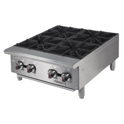 Engineered to handle higher cooking demands, the Kintera Gas Hotplate with 4 Burners (24") provides 25,000 BTUs per burner, ensuring fast and even heat distribution for efficient cooking. Its heavy cast iron grates are easily removable for cleaning, while the stainless steel front and sides offer long-lasting durability. With individual adjustable pilots and large chrome control knobs for each burner, this hotplate gives chefs precise heat control. The extended cool-to-touch front edge enhances safety, and the full-width stainless steel grease catch pan simplifies maintenance. SKU_10015904 Model: KHP24