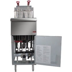 Experience exceptional frying performance with the Kintera Natural Gas Fryer, featuring a robust 4-tube design and a 1-50 lb tank capacity. Constructed with a peened stainless steel tank and smoothed-out welds, this floor model combines durability with a sleek aesthetic. The stainless steel front, top ledge, and header provide a professional finish, while the 1 1/4" ball-type full port drain allows for quick and efficient oil disposal. Designed with a cool zone in the fry tank, this fryer minimizes oil degradation, extending the life of your cooking oil. The built-in flue deflector enhances safety and efficiency, while the 30,000 BTU heat exchange tubes equipped with high-heat baffles ensure rapid heating for consistent frying results. With a double rod stainless steel basket hanger and two nickel-chrome wire mesh fry baskets with red plastic-coated handles, the Kintera fryer offers both functionality and ease of use. The Invensys thermostat allows for precise temperature control between 200°F to 400°F, and the auto reset high limit adds an extra layer of safety. Supported by 6” adjustable legs and a full foam zone for added stability, this fryer is built for heavy-duty commercial use, making it an essential addition to any busy kitchen. SKU_10015912 Model: KF4-N