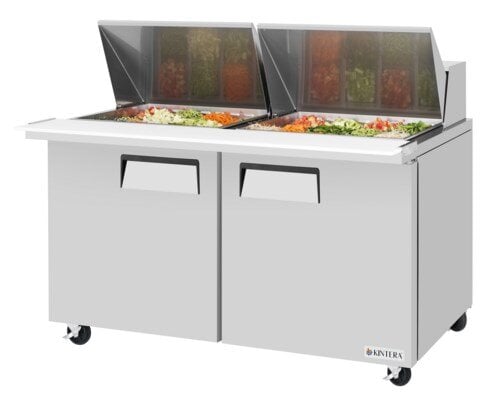 Designed for larger operations, this Kintera Sandwich/Salad Mega Top Unit offers 22.94 cu. ft. of storage and a 24-pan capacity, ensuring ample room for all your prep needs. It features two hooded cold air compartments for consistent cooling, and two solid doors with two adjustable shelves for versatile storage. Complete with a 9-1/2” deep, ½” thick cutting board and easy mobility on 4” swivel casters with front locks, it ensures both durability and convenience in fast-paced kitchens. Dimensions: 60-1/4" x 34" x 39". SKU_10092405 Model: KS60MTZ