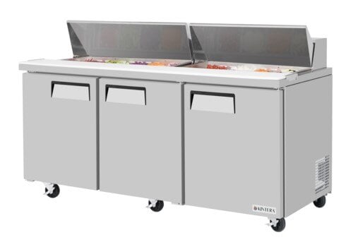 Maximize your kitchen's prep space with the Kintera Sandwich/Salad Refrigerated Counter, featuring 19 cu. ft. of storage capacity. This three-section unit holds 18 1/6 size, 4" deep pans in two hooded cold air compartments for consistent cooling. With three solid doors, three adjustable PE-coated wire shelves, a 9-1/2” deep cutting board, and 4” swivel casters with front locks, this unit is built for convenience and durability. Dimensions: 72-3/4" x 30" x 37". SKU_10092437 Model: KS72Z