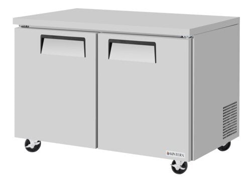 Optimize your kitchen's cold storage with the Kintera Undercounter Refrigerator, offering 13.24 cu. ft. of space in two sections with two adjustable shelves and solid swing doors. Designed for easy integration into tight spaces, this unit features a self-contained refrigeration system that maintains consistent temperatures between 33°F and 38°F, ensuring your perishables stay fresh. Built with a stainless steel door, aluminum exterior sides, and galvanized steel back and bottom, this refrigerator is both durable and easy to clean. The interior includes a stainless steel floor and back with aluminum sides for enhanced hygiene and long-lasting performance. Equipped with 4” diameter swivel casters with locks on the front for easy mobility and stability. Dimensions: 48-1/4" x 30" x 30-3/8". SKU_10092404 Model: KUC48RZ