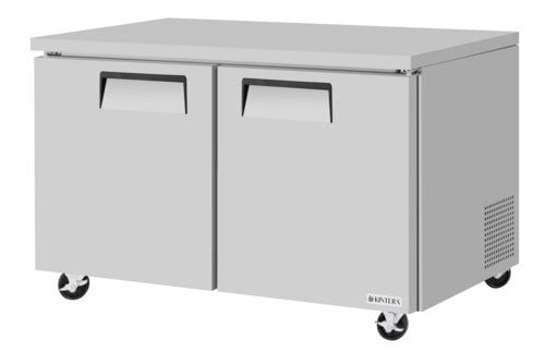 The Kintera Undercounter Refrigerator with 2 sections provides 16.86 cu. ft. of versatile cold storage. Featuring 2 solid swing doors and 2 adjustable shelves, it is designed for optimal efficiency in busy kitchens. Its self-contained refrigeration system maintains food-safe temperatures between 33°F and 38°F. The exterior boasts a stainless steel door, aluminum sides, and a galvanized steel back and bottom for lasting durability. Inside, the stainless steel floor and back, along with aluminum sides, ensure easy cleaning and long product life. Equipped with 4” swivel casters and front locks for secure mobility, this Energy Star qualified unit is an ideal addition to any commercial kitchen. Dimensions: 60-1/4" x 30" x 30-3/8". SKU_10092436 Model: KUC60RZ