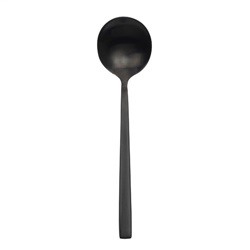 Make a bold statement with the Premier Collections Venu Avaline Dusk Bouillon Spoon. Featuring a sleek matte black finish and straight thin stem this 7-3/8" spoon is ideal for serving soups and broths. Crafted from durable 18/0 stainless steel it's magnetized to reduce loss and dishwasher safe for easy cleanup. SKU_10031661 Model: 924923